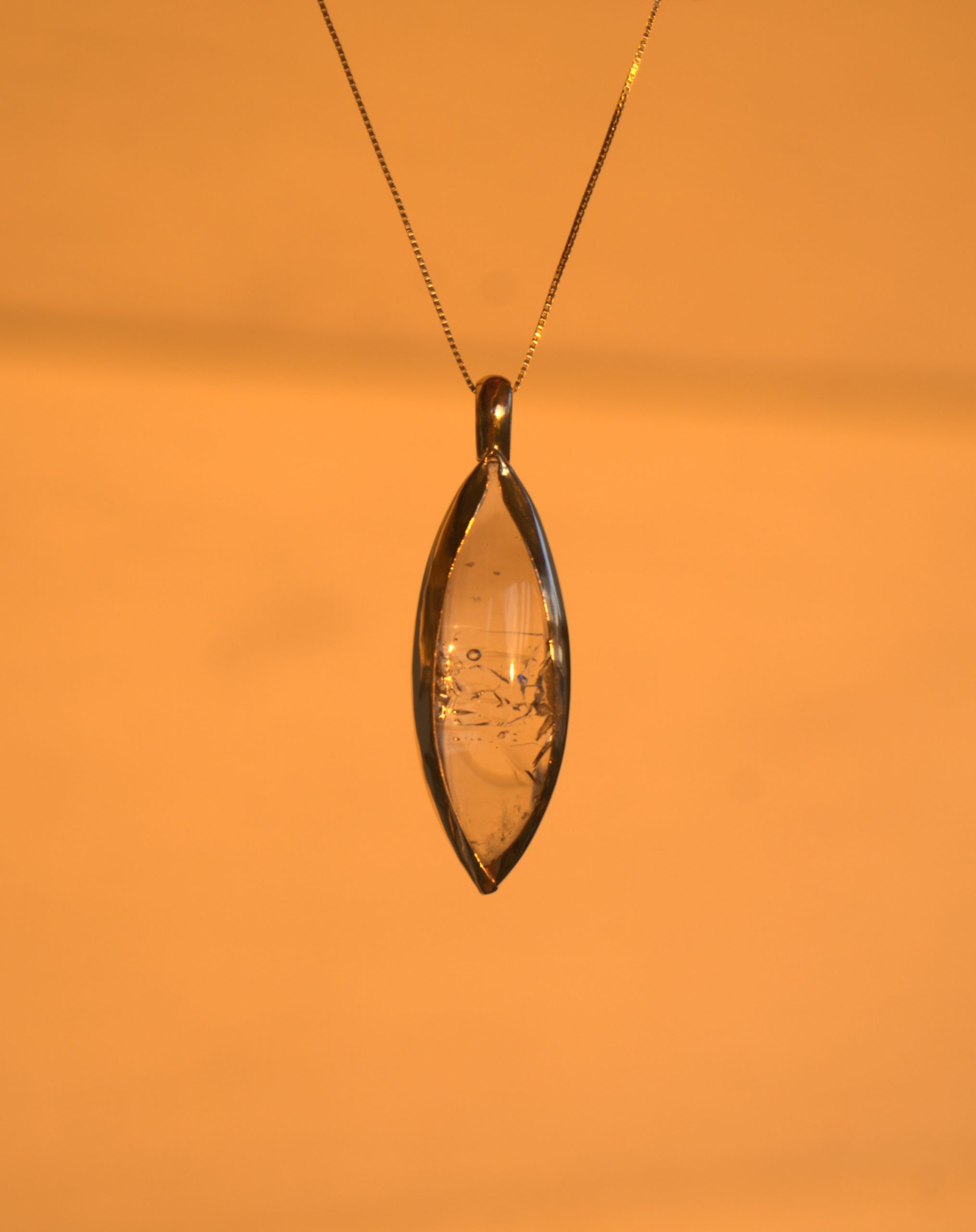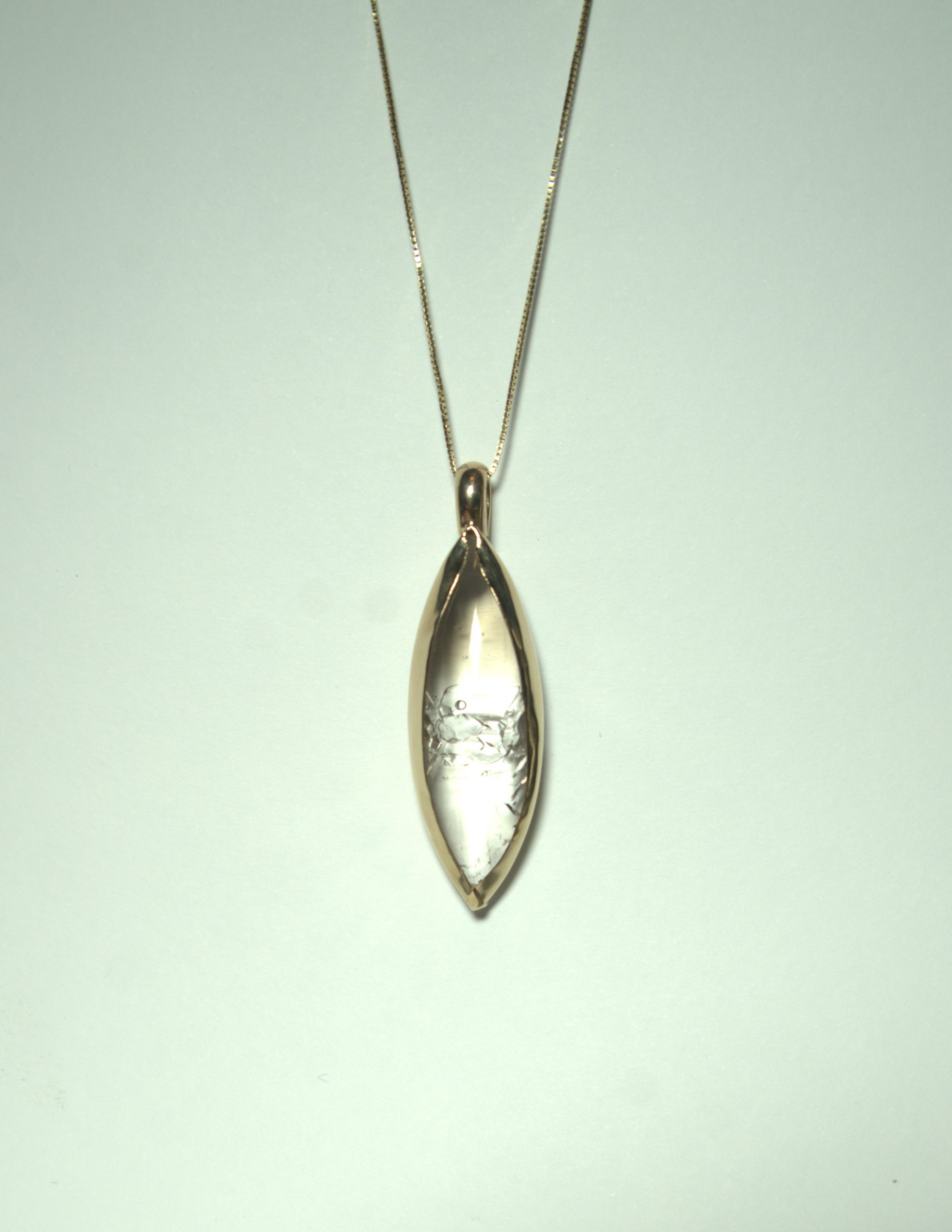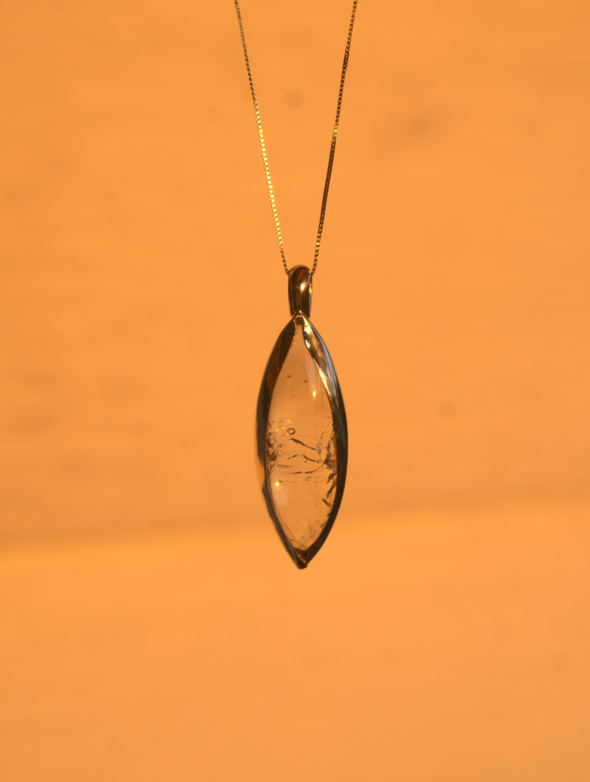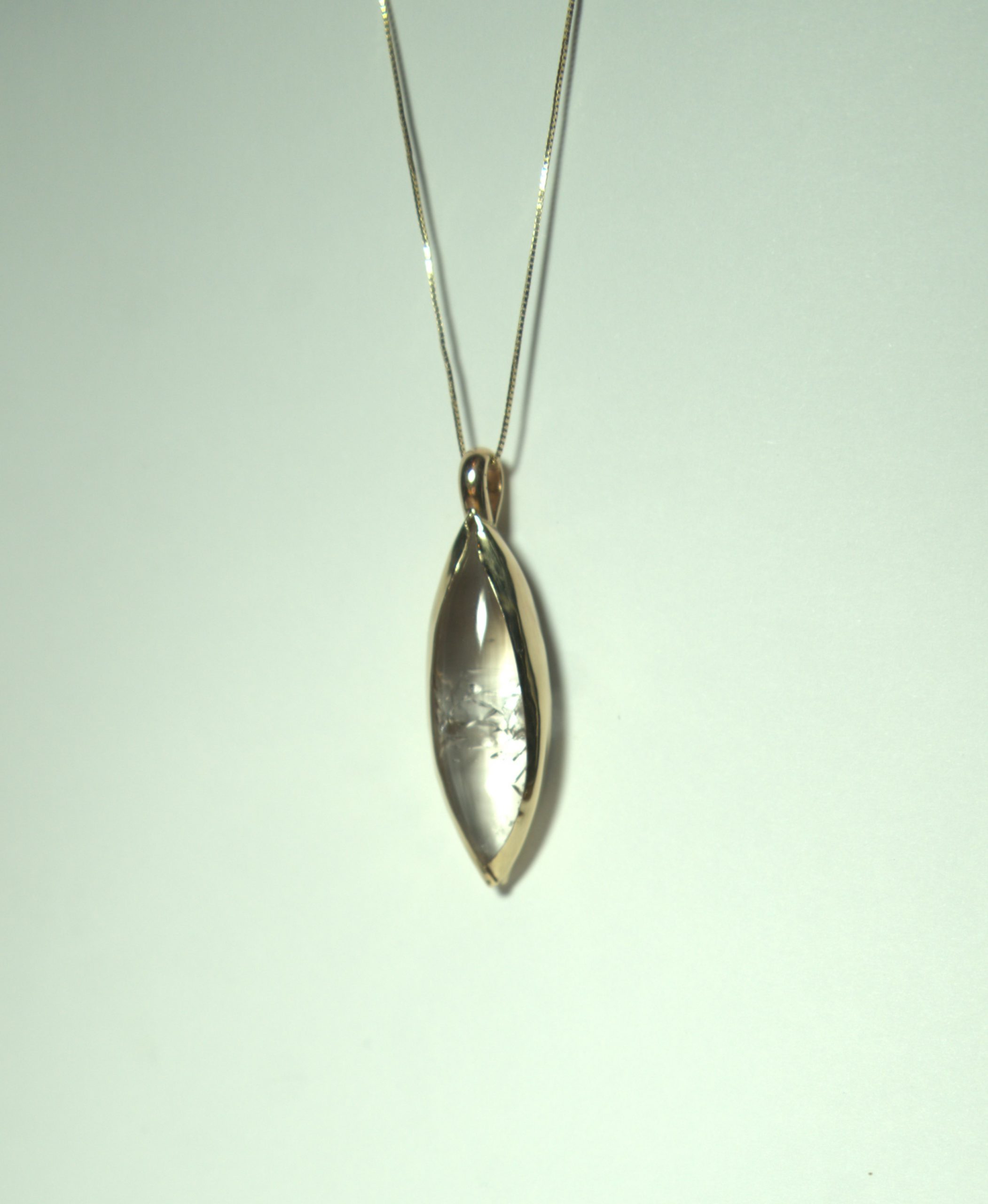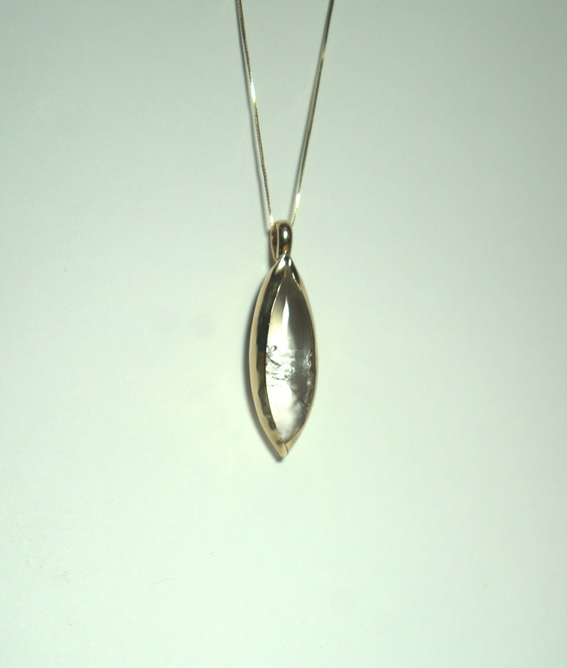 Hand fabricated 14k gold enhydro quartz pendant and chain.